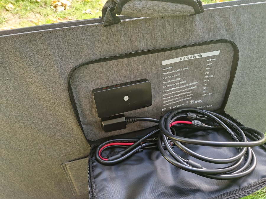 At 400W this is a really useful piece of kit in he right conditions. It weighs in at about 9.25kg (≈ 20 lbs) and folds down reasonably compact. Don’t expect to sling it over your shoulder for miles without noticing. I’ve never tested a foldable panel above 200W before so I was super curious about this.