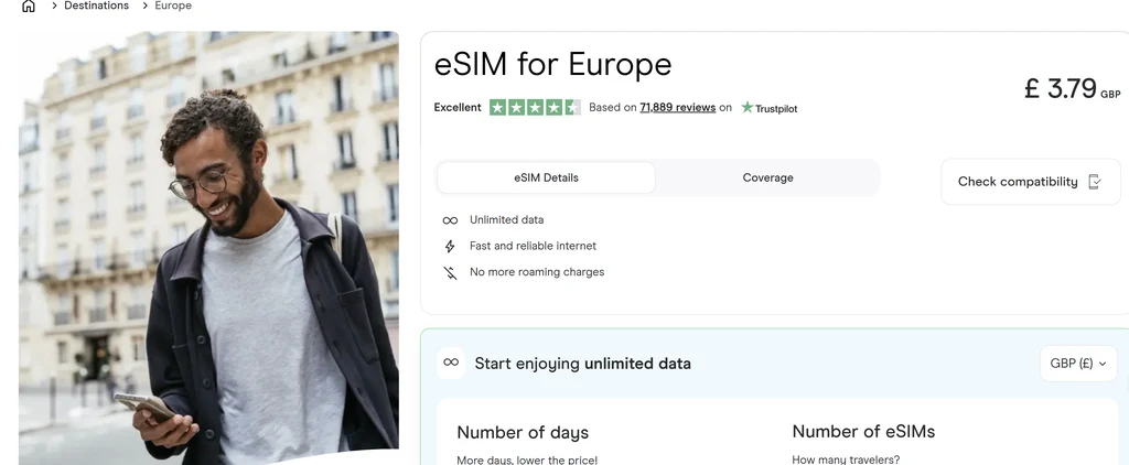 If you want to hop across Europe (not just Spain): Holafly’s Europe-wide plan works beautifully — one regional eSIM for multiple countries.